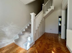 Original wooden Staircase with carpet stair treads to ground floor hall. Doors to bedrooms 1, 2, 3, 4 & family bathroom. Mains smoke detector.